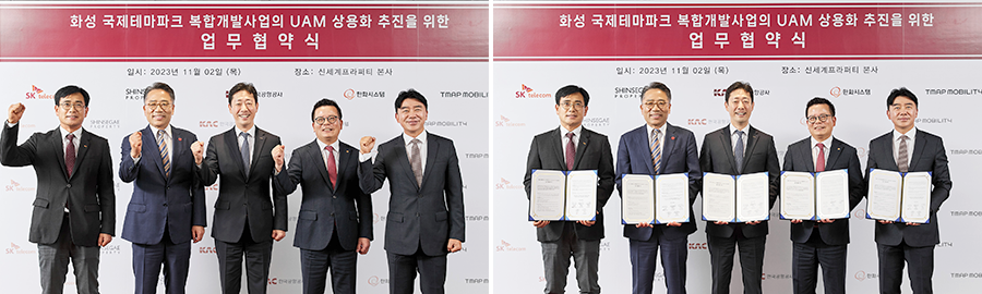 11월 2일(목) 신세계프라퍼티 본사에서 열린 협약식에 참여한 각 사 대표들은 UAM의 핵심 요소인 인프라·기체·교통관리를 유기적으로 운용해 UAM이 화성국제테마파크에서 성공적으로 상용화될 될 수 있도록 적극 협력하는 데 뜻을 모았다.