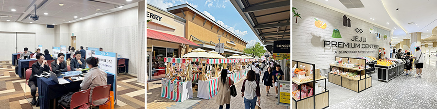 먼저, 신세계사이먼은 오는 21~23일과 28~30일 총 6일간 여주 프리미엄 아울렛 EAST에서 ‘제주상생마켓’ 행사를 연다. ‘여주에서 제주를 느끼다’라는 주제로 총 24개 업체가 참여해 지역 먹거리와 제주 관광 콘셉트의 잡화 및 액세서리를 선보인다. 이 중 4개 업체는 제주에서 진행한 구매상담회를 통해 유치한 판매자다. MZ세대가 선호하는 제주산 다이어트 가공품, 흑보리로 만든 대체커피, 저탄수 전통음료 등 지역 농·특산물로 만든 특화 상품을 선보인다. 플리마켓 앞에는 무지개 해안도로와 감귤밭 등 제주도의 감성을 느낄 수 있는 포토존도 설치된다.