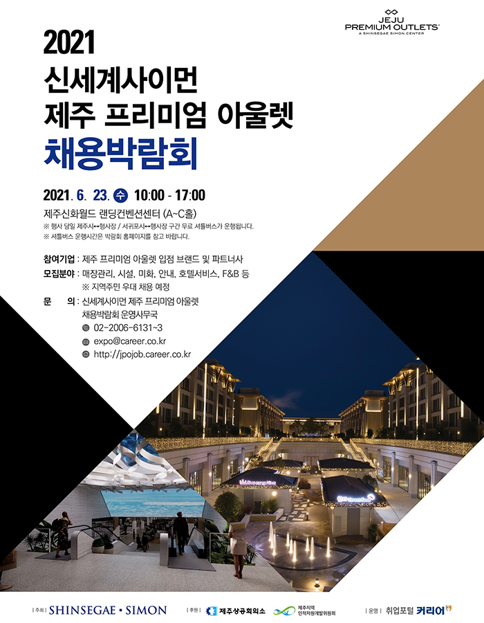 신세계사이먼은 오는 23일(수) 오전 10시 부터 ‘제주신화월드 랜딩컨벤션센터’에서 ‘제주 프리미엄 아울렛 채용박람회’를 개최한다고 밝혔다. 채용박람회는 ‘신세계사이먼’이 주최하고, ‘제주상공회의소’, ‘제주지역 인적자원개발위원회’가 후원한다.