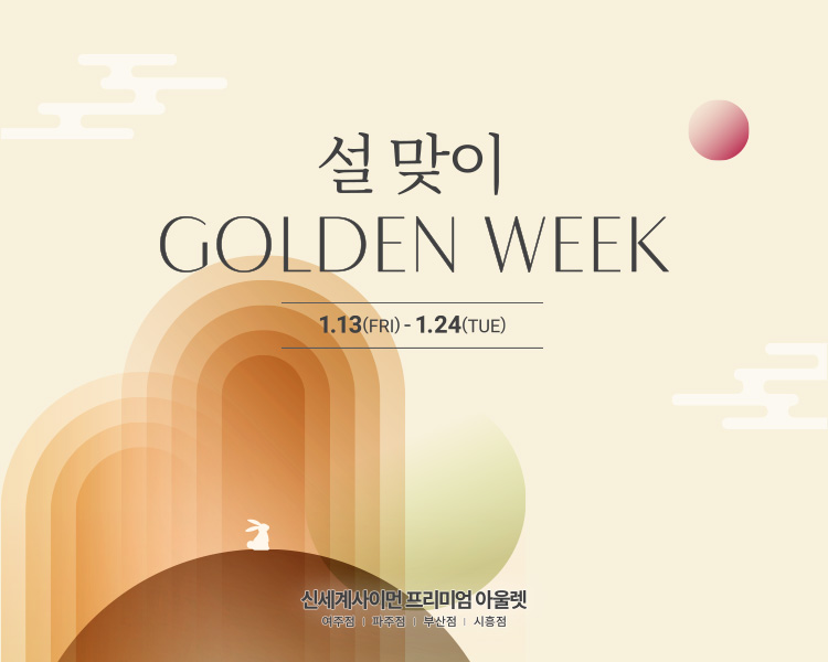 신세계사이먼(대표 김영섭)이 1월 13일(금) 부터 24일(화)까지 명절 연휴 기간을 맞아 여주 · 파주 · 부산 · 시흥 프리미엄 아울렛에서 ‘설 맞이 골든위크(GOLDEN WEEK)’를 진행 한다. (연휴기간 정상 영업, 단 1월 22일(설) 설 당일 휴점)