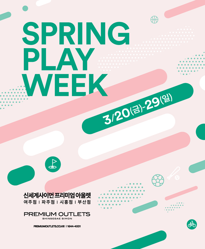 신세계사이먼(대표 : 조창현) 프리미엄 아울렛이 20일(금)부터 29일(일)까지 ‘스프링 플레이 위크’를 개최한다. 이번 프로모션은 여주, 파주, 시흥, 부산 프리미엄 아울렛 전 점에서 동시에 개최되며, 봄 맞이 스타일링을 위한 스포츠, 골프, 아웃도어 등 국내외 인기 브랜드들의 봄 시즌 아이템들을 최초 정상가 대비 최고 80% 할인한다.