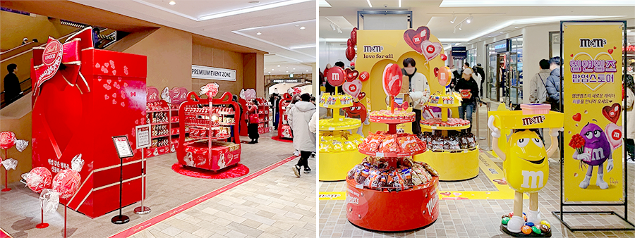 파주 프리미엄 아울렛 종합관 내 1층에는 미국 대표 초콜릿 브랜드 엠앤엠즈(M&M’s)의 팝업스토어가 들어섰다. 엠앤엠즈의 2024년 밸런타인데이 한정 선물세트를 비롯해 몰티져스, 트윅스 등 40여 종의 상품을 구매할 수 있다.