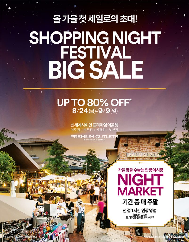 신세계사이먼(대표: 조병하)은 오는 24일부터 9월 9일까지 여주∙파주∙시흥∙부산 프리미엄 아울렛에서 ‘쇼핑 나잇 페스티벌 빅 세일(Shopping Night Festival Big Sale)’을 개최한다.