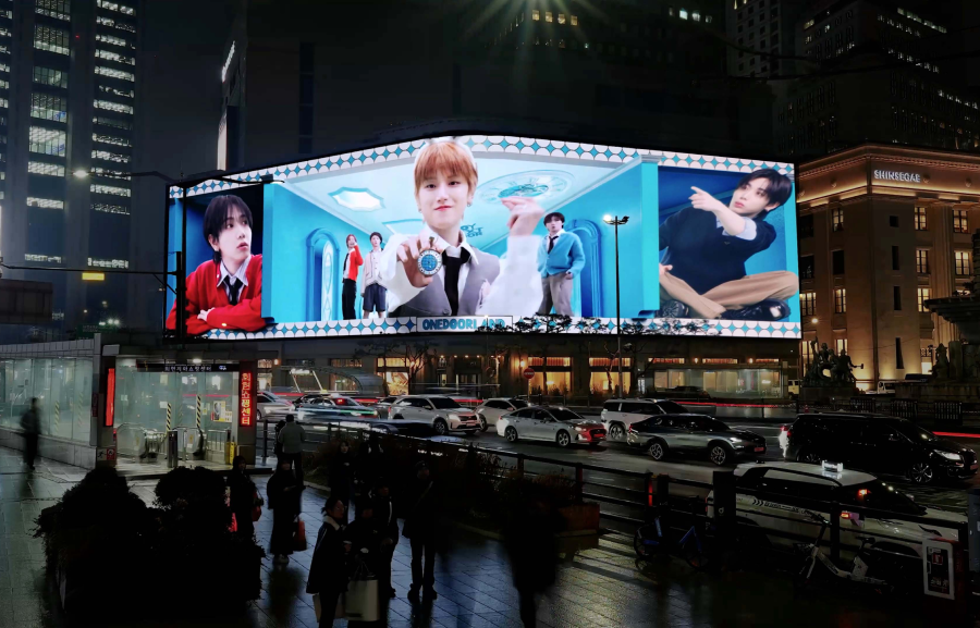 신세계백화점 본점 신세계스퀘어에 인기 K-POP 스타 보이넥스트도어와 협업한 영상으로 매 시각을 알린다.