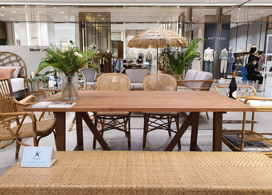 우선 1층 아트리움에서는 통기성이 좋아 시원한 ‘시카디자인’ 가구를 준비했다. 친환경 소재인 라탄을 사용해 인체에 무해하고 바람이 잘 통해 여름용 가구로 활용도가 높다. 대표 상품으로는 이사벨 암체어 32만 1천원, 도나델로 사이드 테이블 54만 1천원, 에그 체어 456만 9천원 등이 있다.