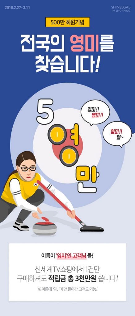 신세계TV쇼핑은 500만 돌파 기념과 더불어 최근 이슈가 된 컬링을 홍보하고자 3월 11일(일)까지 ‘전국에 영미를 찾습니다’ 이벤트를 진행한다. 해당 이벤트 기간 내 신세계TV쇼핑에서 상품을 구매 하신 모든 고객 중 이름이 ‘영미’이거나, ‘영’ 혹은 ‘미’자가 들어간 고객을 대상으로 추첨을 통해 1등 1명에게는 쇼핑지원 적립금 500만원, 이하 500명에게는 쇼핑지원 적립금 5만원을 각각 증정한다.