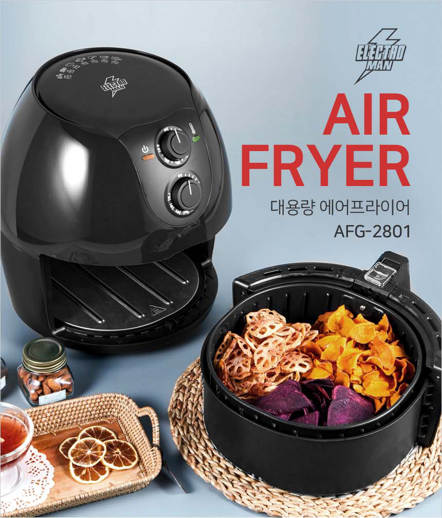 5.5L 대용량 바스켓은 삼계탕용 550g(6호) 생닭을 4마리까지 넣고 조리를 할 수 있는 크기로, 온 가족 분량의 다양한 요리에 활용할 수 있다. 깔끔한 투톤(Two Tone) 블랙 컬러에 일렉트로맨 로고를 넣고, 간편한 다이얼 조작 방식을 채용했다. 또, 환풍기 크기를 키워 발열을 최소화했다.
