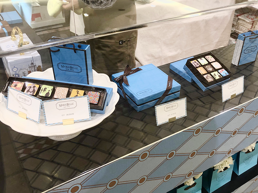 마리벨은 화사한 코발트 블루 색상의 패키지가 특징으로 보석 상자에 담긴 시그니처 가나슈 콜렉션이 대표 상품이다. 가격은 가나슈 콜렉션 25구에 12만9000원. 온두라스 초콜렛에 스위스 코코아 파우더와 신선한 크림이 더해진 마리벨 트러플 박스도 4만9000원에 판매한다.