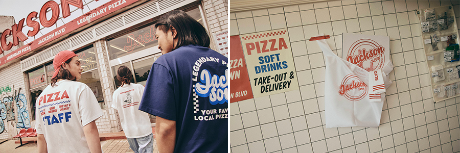 주력 제품인 그래픽 티셔츠는 잭슨피자의 다양한 그래픽과 재치있는 문구들을 활용해 눈길을 끈다. 피자 점원을 연상시키는 그래픽부터 먹음직스러운 피자조각이 담긴 제품까지 화이트, 옐로우, 네이비 등 5가지 색상으로 선보인다. 모자, 가방, 양말 등 티셔츠와 함께 코디하면 여름철 포인트 룩을 완성시킬 수 있는 다양한 액세서리 제품도 함께 출시된다. 특히 잭슨피자의 비닐 쇼핑백을 연상시키는 쇼퍼백은 펀슈머들의 구매욕을 자극하는 재치있는 디자인으로 조기 품절이 예상된다.