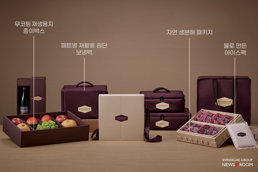 신세계백화점의 과일 선물세트 박스와 와인 패키지는 무(無)코팅 재생 용지에 콩기름으로 인쇄한다. 보냉백과 단열 박스는 페트병을 재활용한 원단과 종이 등으로 제작하고, 아이스팩도 물과 단일 재질 비닐을 사용한다.