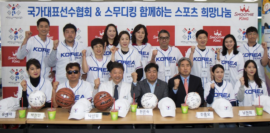 2일 서울 종로구 연건동 서울대학교 어린이병원에서 열린 희망 나눔행사에는 남현희(펜싱), 진종오(사격), 양동근(농구) 등 국가대표 선수협회 소속 선수 16명과 스무디킹 임직원들이 함께 소아암 환우들의 치유를 응원하기 위한 사인회를 열었다.