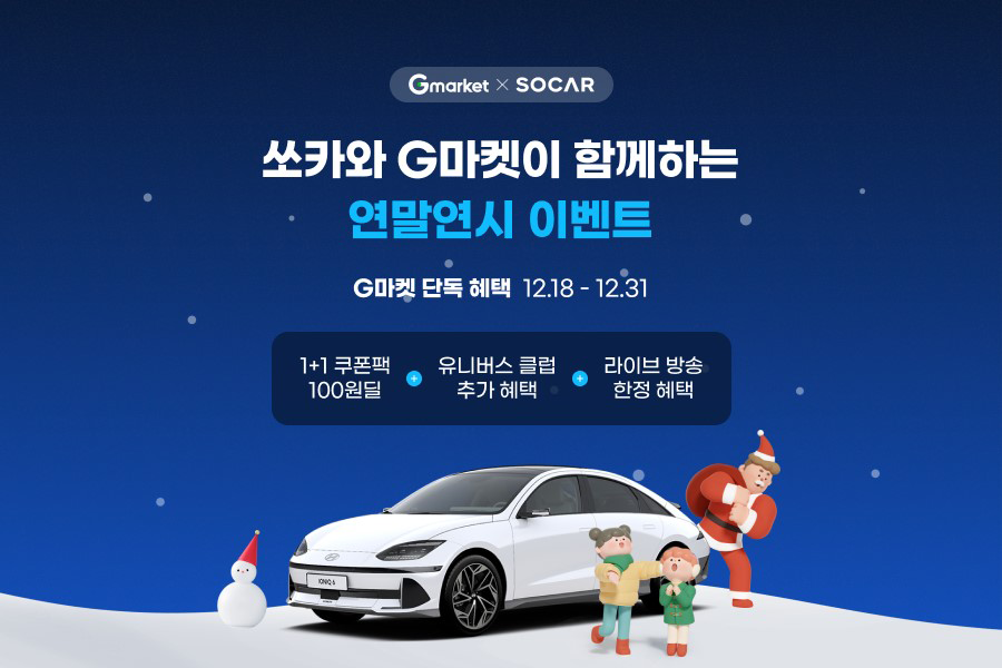 국내 대표 온라인 마켓플레이스 G마켓이 오는 31일까지 ‘쏘카와 G마켓이 함께하는 연말연시 이벤트’를 열고, 쏘카 쿠폰팩 100원딜을 단독으로 진행한다. 연말 연휴를 맞아 차량 렌트 수요가 증가하고 있어 이번 제휴 프로모션을 기획했다.