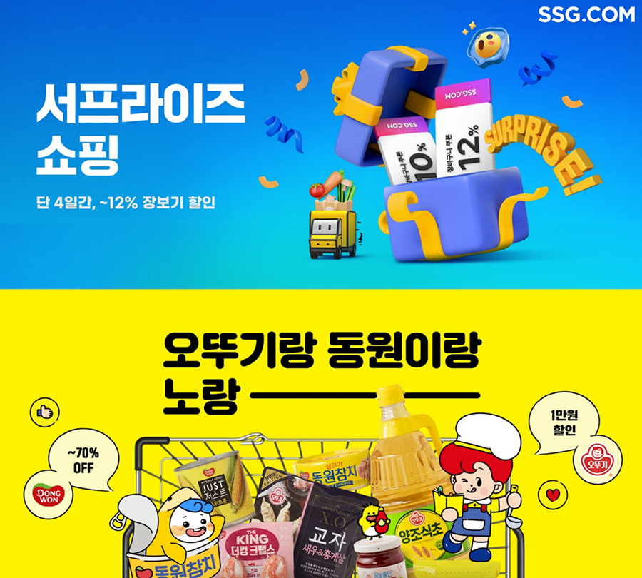 이와 함께, 25일까지 ‘오뚜기랑 동원이랑 노랑’ 행사를 열어 오뚜기·동원 행사 상품 4만원 이상 구매 시 1만원 즉시 할인 혜택을 제공한다. 2만원 이상 구매 고객 중 추첨을 통해 최대 2만원의 SSG머니를 지급하는 이벤트도 진행한다.