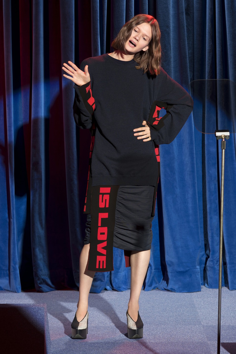 이번 시즌 아티스트 우르스 피셔(Urs Fischer)와의 협업으로 완성한 ‘All is LOVE(모두 사랑이다)’ 슬로건을 선보였다. 슬로건이 프린트된 리본은 셔츠, 스커트, 드레스 등의 솔기에 더해져 리본처럼 나부낀다. 화이트 셔츠에는 블랙 프린트가, 검정 티셔츠와 스커트에는 레드 색상 문구가 표현돼 메시지가 뚜렷하게 드러난다. 이는 의상에 특별함을 더해 색다른 실루엣의 의상을 만들어냈다.