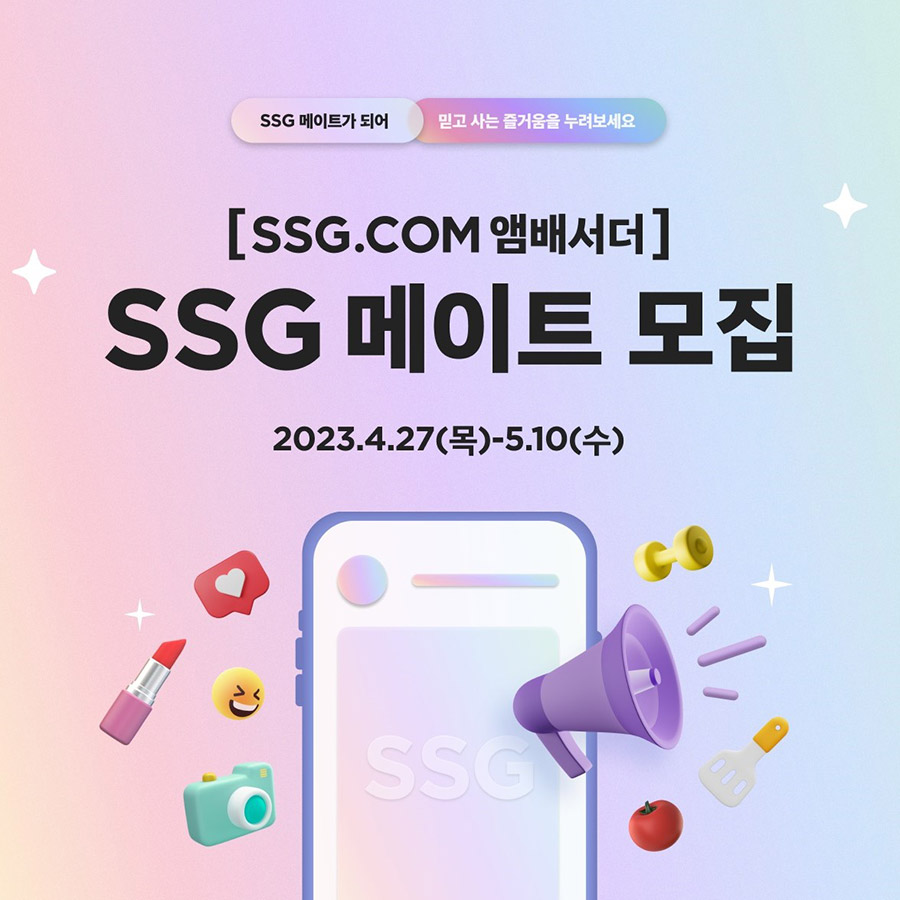 SSG닷컴이 오는 27일부터 다음달 10일까지 브랜드 공식 일반인 앰배서더 ‘SSG 메이트’를 모집한다고 26일 밝혔다. 인스타그램 공개 계정을 운영하는 고객이라면 누구나 지원할 수 있다.