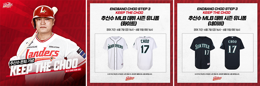 ‘Keep the Choo’ 프로젝트의 첫 경매 물품은 추신수 선수의 ‘MLB 데뷔 시즌 유니폼 2종’이다. 경매는 7일(금) 오후 4시부터 11일(화) 오후 4시까지 진행되며, SSG의 공식 어플리케이션 ‘SSG Landers’ 내 ‘랜더스 옥션’ 페이지에서 참여 가능하다.
