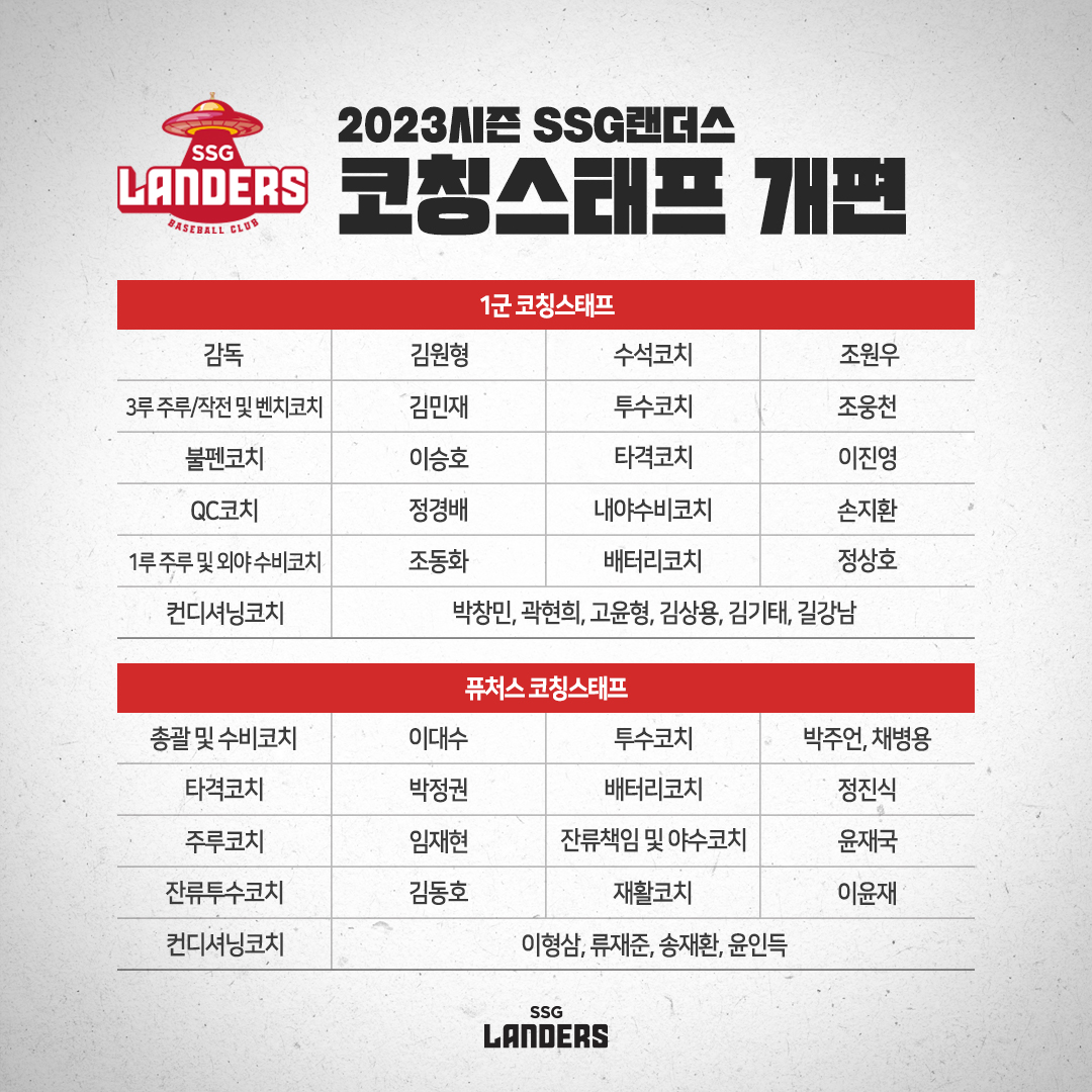 MEDIA 글자 크기 보통 크게 아주 크게 공유하기 페이스북 X 카카오톡 링크 복사 링크 복사됨 도구 보기 이미지 다운로드 SSG 랜더스, 코칭스태프 개편 2022.12.15 신세계야구단