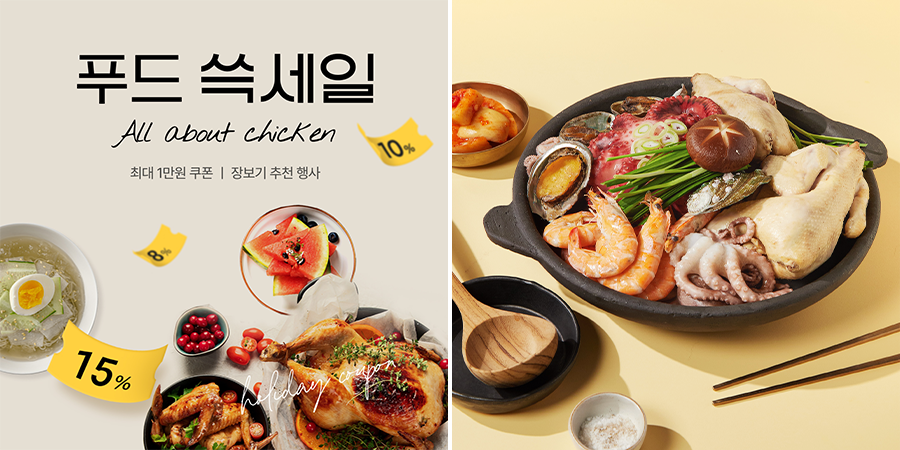 보양식의 대명사인 삼계탕과 닭고기 양념육, 프라이드치킨 등 닭과 관련된 모든 상품을 최대 반값에 선보인다. 대표 브랜드로 조선호텔, 푸라닭, 네네치킨 등이 참여하며 닭요리와 함께 먹기 좋은 편이과일, 음료 등도 할인가에 만나볼 수 있다.