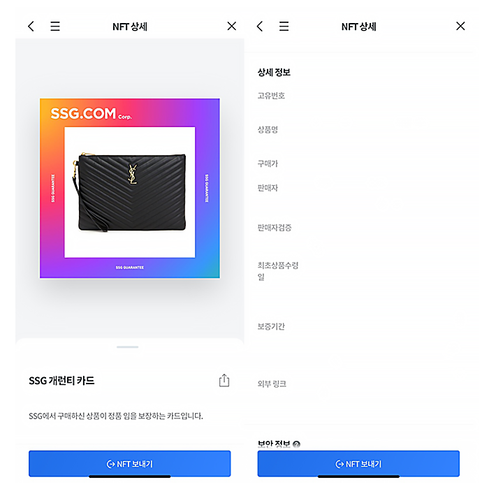 SSG닷컴이 제공하는 디지털 보증서는 그라운드X사의 블록체인 플랫폼 ‘클레이튼’이 개발한 NFT 기반 기술을 사용한다. NFT란 ‘Non-Fungible Tokens’의 약자로 블록체인 기술을 활용해 소유권 등 고유 자산을 담아 발행한 토큰이다. 명품 하나하나마다 각기 다른 고유 시리얼 넘버가 보증서에 기재되며 한 번 생성된 보증서는 복제 또는 위·변조가 불가능해 보안성이 우수하다.
