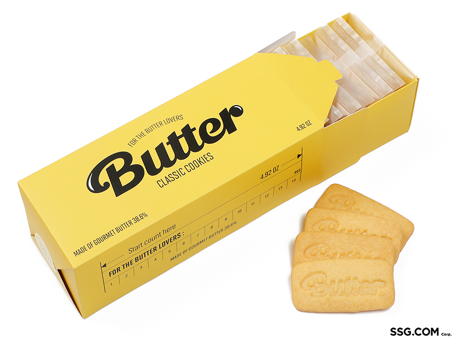 뱅앤베이커스는 하이브에서 지난해 상표 출원한 베이커리 브랜드다. 이번에 판매하는 ‘버터쿠키’는 방탄소년단의 곡 ‘버터(Butter)’의 그래픽 요소를 반영한 패키지 디자인으로 제작했으며 38.6%의 높은 버터 함유량으로 부드러운 식감이 특징이다. 프랑스 AOP 인증을 받은 프리미엄 레스큐어 버터를 사용해 진하고 향긋한 버터 풍미를 느낄 수 있으며 가격은 2만원이다.