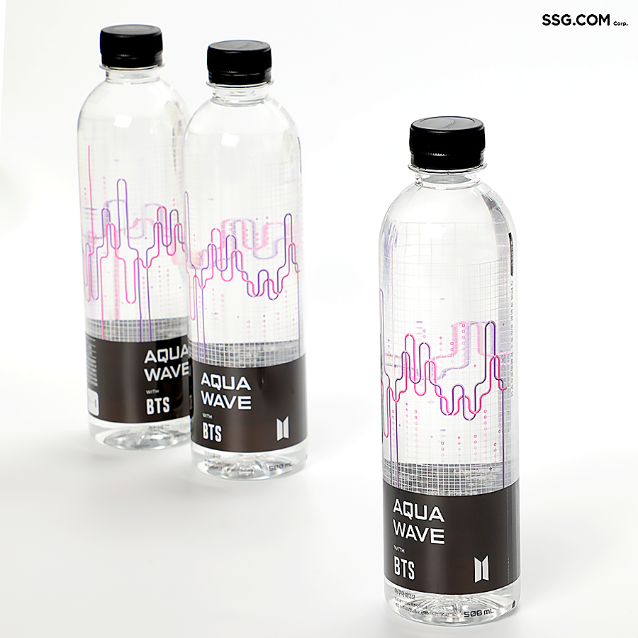 ‘아쿠아웨이브 with BTS’도 지난 6월 하이브가 선보인 프리미엄 생수 제품이다. 강원도 속초 청정 해역의 수심 200m 이하에서 추출한 해양 심층수를 담은 것이 특징이다. 500ml 용량의 생수 20개입을 묶어 1팩으로 구성했으며 가격은 2만 4천원이다.