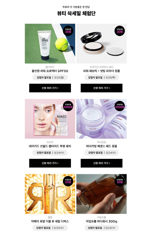 SSG닷컴은 15일부터 21일까지 1주일간 진행되는 ‘뷰티 쓱세일’에서 최대 1만명의 뷰티 체험단을 모집한다고 14일 밝혔다. 이를 위해 ‘랩시리즈’, ‘조르지오 아르마니 뷰티’, ‘겔랑’을 비롯한 30여개 뷰티 브랜드의 1만여개 상품을 무상 제공한다. 피부미용에 관심있는 고객이라면 누구나 댓글로 체험단에 지원할 수 있으며, 체험단으로 선정되면 체험 후 솔직한 사용 경험을 쓱닷컴 모바일앱에 리뷰 형태로 등록하면 된다.