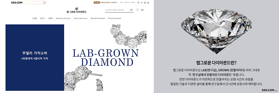 SSG닷컴은 연구실에서 만들어 친환경적이고 합리적인 가격대가 특징인 ‘랩그로운 다이아몬드(Lab Grown Diamond)’ 공식브랜드관을 오픈한다고 22일 밝혔다. ‘세그먼트에이’, ‘존폴쥬얼리’, ‘디네치’ 3개 브랜드, 350여 개 상품을 선보인다.