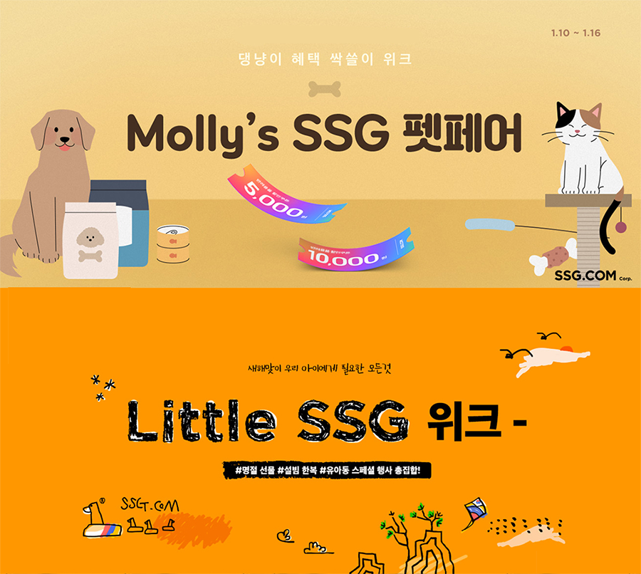 SSG닷컴은 10일부터 16일까지 반려동물 용품 전문관 ‘몰리스 SSG’와 유아동 전문관 ‘리틀 쓱’에서 각각 프로모션을 실시한다고 밝혔다.
