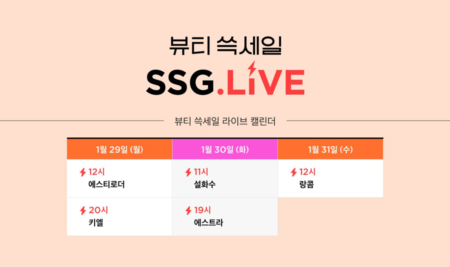 SSG닷컴은 29일부터 31일까지 3일간 총 5회의 ‘릴레이 뷰티 쓱라이브(SSG.LIVE)’를 특별 편성하고 풍성한 혜택을 제공한다. 29일에는 ‘에스티 로더(정오)’와 ‘키엘(오후8시)’, 30일 ‘설화수(오전11시)’, ‘에스트라(오후7시)’, 31일 ‘랑콤(정오)’ 등 국내외 주요 뷰티 브랜드의 대표 아이템 및 기프트 세트를 최대 34% 할인 판매하는 특별 라이브 방송을 잇따라 진행한다.