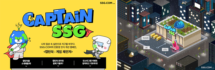 SSG닷컴은 ‘시간’을 활용해 환경파괴 위기감을 직관적으로 표현했다. 현재는 위험 단계인 9시 28분을 가리키고 있으며 미션 성공으로 시간을 늦춰야 한다는 세계관을 설정해 몰입감을 높인 것이 특징이다. 고객은 메타버스 내 ‘쓱본부’에 들어가 쓱닷컴 대표 캐릭터와 함께 여러 미션을 수행하며 문제를 해결하게 된다.