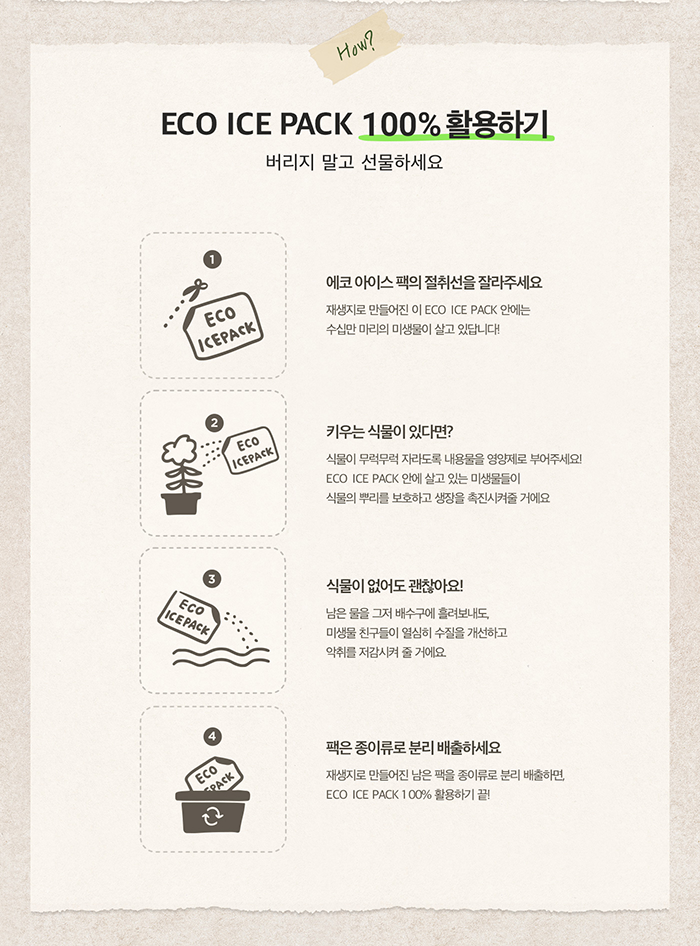 즉, 새벽배송 이용 고객이 아이스팩을 버려야 할 때 포장지를 찢어 내용물을 하수구에 따라버리면 강이나 하천 등 오수 정화 효과를 볼 수 있다. 또한 가정 내 식물 생장을 촉진하는 영양제로도 활용할 수 있어 환경 보호에 직접적으로 일조하게 되는 장점이 있다.