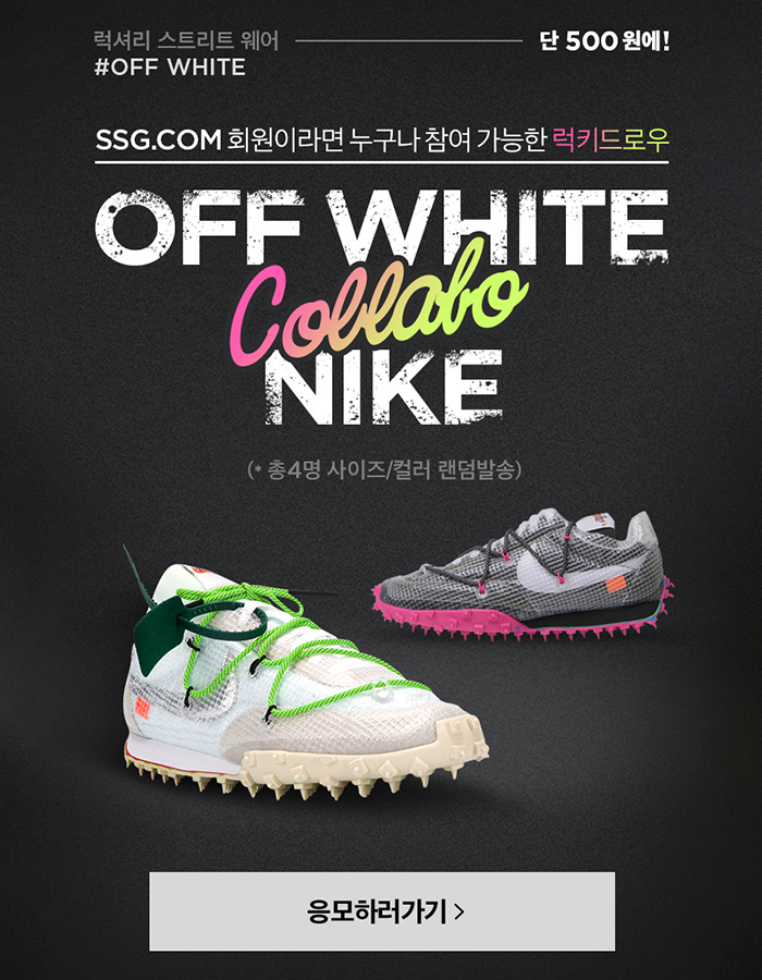 같은 기간 동안 SSG닷컴 회원이라면 누구나 응모 가능한 럭키드로우 이벤트도 진행한다. ‘오프화이트’와 ‘나이키’가 협업한 ‘와플레이서 운동화’ 500원 구매 기회를 4명에게 부여한다.