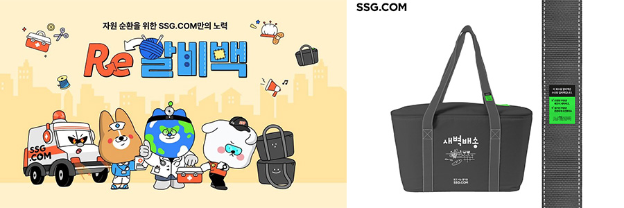 쓱닷컴은 새벽배송 첫 주문 시 무료로 받은 ‘흰색 알비백’을 내놓지 않는 경우 제공되는 ‘회색 회수용 알비백’을 수선하고 세척해 재사용한다. 재사용이 어렵다고 판단되는 경우에는 분해 후 테라사이클을 통해 소재별로 재활용한다.
