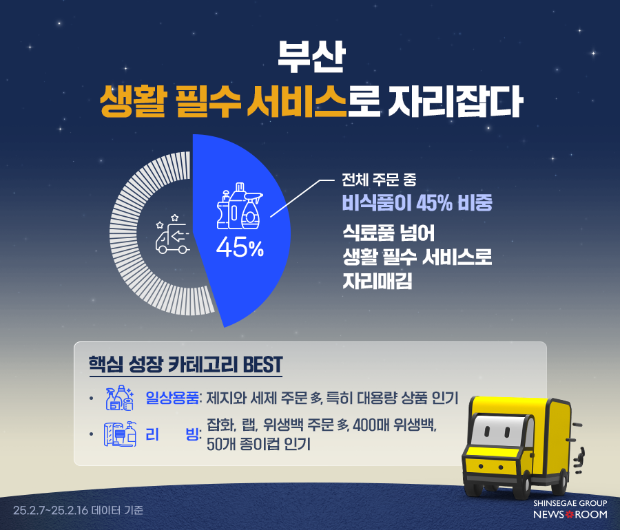 부산 지역에서는 ‘비식품’ 구매가 증가하며, SSG닷컴 새벽배송이 ‘생활 필수 서비스’로 자리매김하고 있다. 2월 7일부터 16일까지 10일간의 주문 데이터를 분석한 결과, 전체 주문의 45%가 비식품이었다.