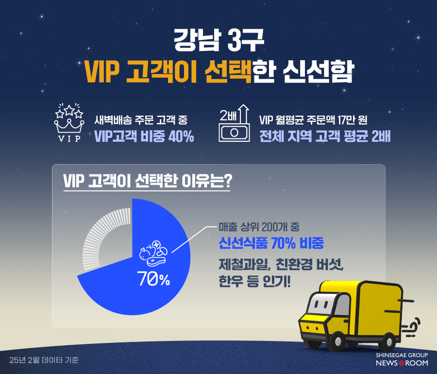 강남 3구(강남·서초·송파구)에서는 VIP 고객을 중심으로 SSG닷컴의 ‘신선식품 경쟁력’이 입증되고 있다. 새벽배송 이용 고객 10명 중 4명이 VIP이며, 이들의 월평균 주문액(17만 원)은 전체 평균의 두 배 수준이었다. VIP 고객이 SSG닷컴 새벽배송을 선택하는 가장 큰 이유로는 ‘신선식품 경쟁력’이 꼽혔다.