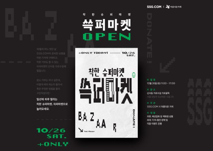 한편, SSG닷컴은 기부행사를 널리 알리기 위해 SNS 인증 이벤트도 실시한다. ‘쓱퍼마켓’ 방문 혹은 상품 구입 사진을 찍어 #SSG, #쓱퍼마켓 등 지정된 해시태그를 사용해 SNS에 공유하면 현장에서 ‘보성 유기농 말차’ 음료를 증정할 계획이다.