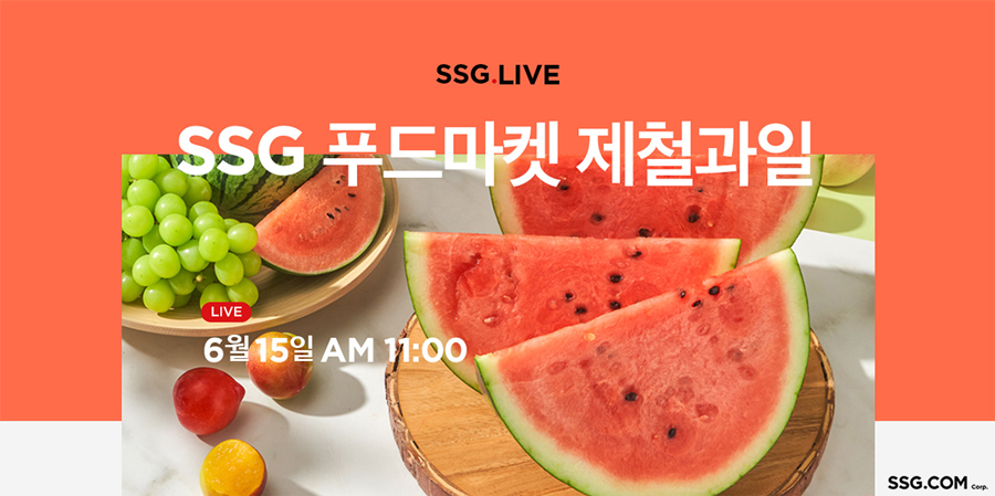 SSG닷컴은 15일 오전 11시부터 라이브커머스 ‘쓱라이브(SSG.LIVE)’에서 ‘SSG푸드마켓 여름 제철과일 최대 50% 할인 특가’ 방송을 진행한다고 밝혔다.