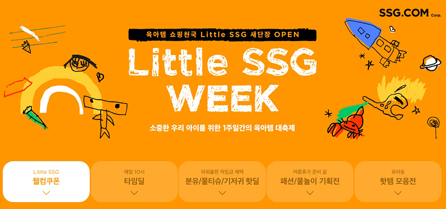 먼저 유아동 상품에 적용 가능한 ‘리틀 쓱 웰컴쿠폰팩’ 2종(5%/10%)을 발급한다. 또한 매일 오전 10시부터 인기 상품을 특가에 만나볼 수 있는 타임딜 행사를 진행한다. 행사 첫 날인 12일(월)에는 유아복 브랜드 ‘압소바 내의’를 30% 할인가에 판매하며 추가 할인쿠폰 20%을 발급해 가격 혜택을 높였다. 13일(화)에는 ‘하기스 썸머 기저귀’ 판매에 나서며 구매 고객에게 스타벅스 커피 기프티콘을 증정한다.