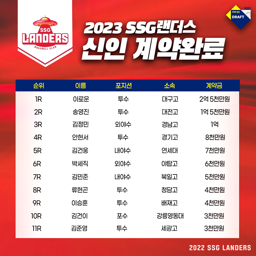 SSG랜더스(대표이사 민경삼, 이하 SSG)가 11일(화) 2023년 신인 선수 11명 전원과 계약을 완료했다.