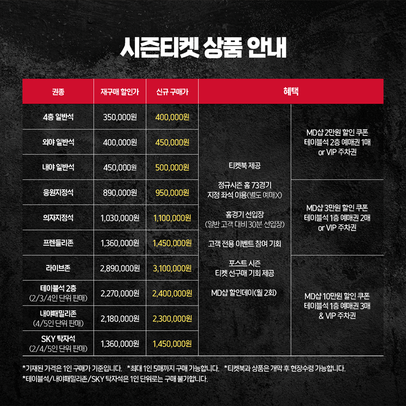 시즌티켓 가격은 내야 일반석 50만원, 응원지정석 95만원, 테이블석 240만원, 내야패밀리존 230만원, 라이브존 310만원을 포함해 총 10개 상품으로 구성됐다. 특히 모든 구매자는 별도 예매 없이 자신이 지정한 좌석을 매 경기 이용할 수 있으며, 출입 카드 대신 티켓북 형태로 제공 받는다.