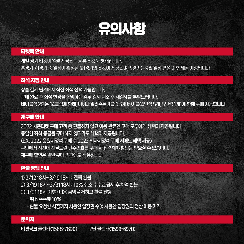 좌석별 세부 가격 및 혜택 등 자세한 사항은 구단 콜센터(1599-6970)와 티켓링크 콜센터(1588-7890)에서 안내 받을 수 있다.