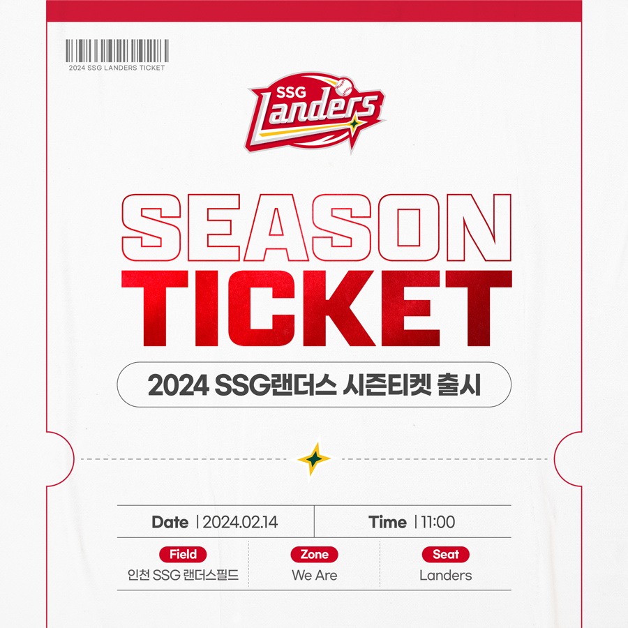 SSG랜더스(대표이사 민경삼, 이하 SSG)는 14일(수)부터 24일(토)까지 2024 시즌티켓을 순차 판매한다.