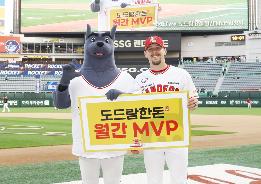 SSG랜더스(대표이사 민경삼, 이하 SSG)는 12일(화) 인천SSG랜더스필드에서 열린 KT 위즈와의 홈경기에 앞서 ㈜도드람푸드(대표이사 임채권, 이하 도드람)와 함께 ‘도드람한돈 8월 MVP’ 시상식을 진행했다.