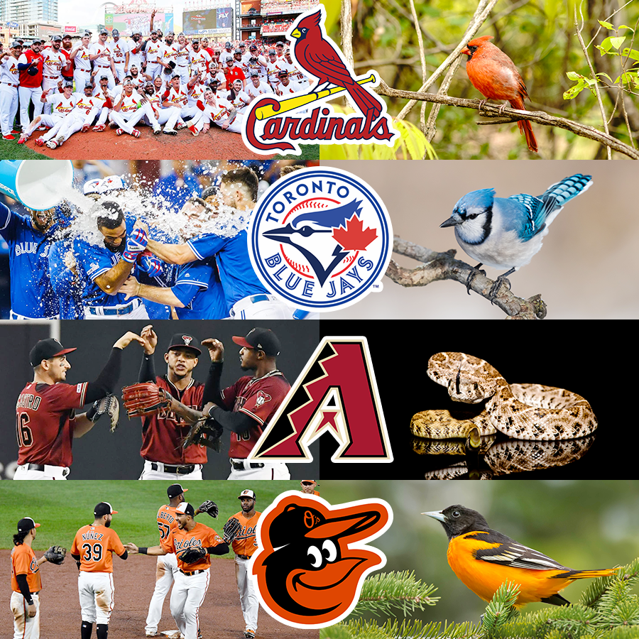 현재 김광현 선수가 뛰고 있는 팀으로 국내 팬들에게 잘 알려져 있는 세인트루이스 카디널스는 카디널(Cardinal)이 홍관조를 의미하는데 세인트루이스 지역에 많이 서식하고 과거 선수들도 그에 따라 카디널(진홍색) 스타킹을 신었다는 사실에 기초해 정해졌다. 류현진 선수가 에이스 투수로 활약하고 있는 토론토 블루제이스의 경우, 블루제이(Blue jay)가 큰어치라는 새를 뜻하는데, 토론토가 속한 캐나다 온타리오(Ontario)주를 상징하는 새이다. 이 밖에도, 김병현 선수가 월드시리즈 우승을 이끌었던 애리조나 다이아몬드백스는 애리조나주에 서식하는 ‘방울뱀(Diamondback)’에서 착안했다. 과거 김현수 선수가 활약했던 볼티모어 오리올스는 오리올(Oriole)이 꾀꼬리를 뜻하는데, 오리올은 볼티모어가 소속된 메릴랜드주를 상징하는 새이다.