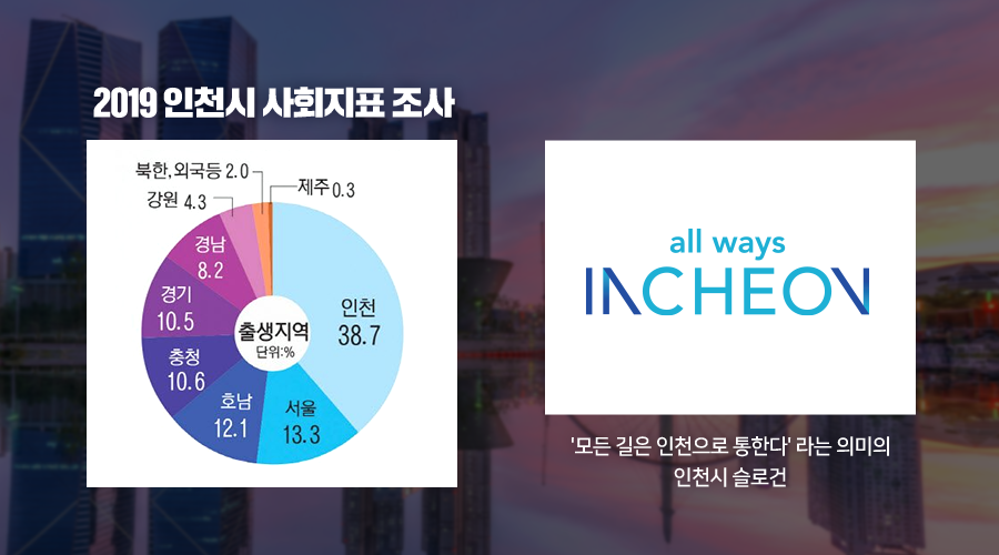 실제로, 인천시가 발표한 ‘2019년 인천 사회지표’ 조사 결과를 보면, 시민 가운데 인천에서 태어난 비율은 38.7%에 그쳤다. 300만 인구에 달하는 인천은 상대적으로 토박이가 적은 도시이다. 하지만 인천은 인천시 브랜드 슬로건 ‘올 웨이즈 인천(All ways Incheon)’처럼 모든 길이 통하는 곳이다.