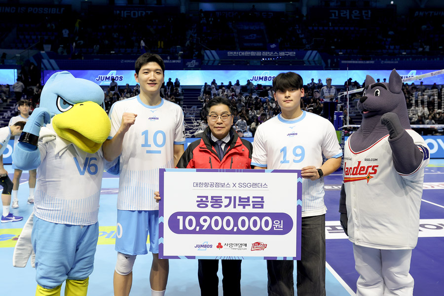 SSG랜더스(대표이사 김재섭, 이하 SSG)가 16일(화) 인천계양체육관에서 열린 대한항공 점보스(이하 대한항공)의 홈경기 ‘랜더스 데이’에 앞서 공동 기부금 전달식을 진행했다.