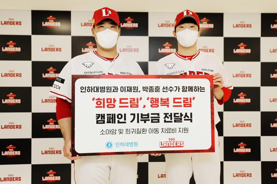 SSG랜더스(대표이사 민경삼, 이하SSG)의 이재원 선수와 박종훈 선수가 지난 9일(금) 인하대병원과 함께하는 ‘희망 드림 캠페인’과 ‘행복 드림 캠페인’을 통해 적립한 기부금을 전달했다.