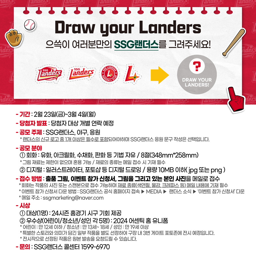 SSG랜더스(대표이사 민경삼, 이하 SSG)는 2월 23일(금)부터 3월 4일(월)까지 구단 공식 인스타그램 및 이벤트 이메일을 통해 ‘Draw Your Landers’ 이벤트를 진행한다.
