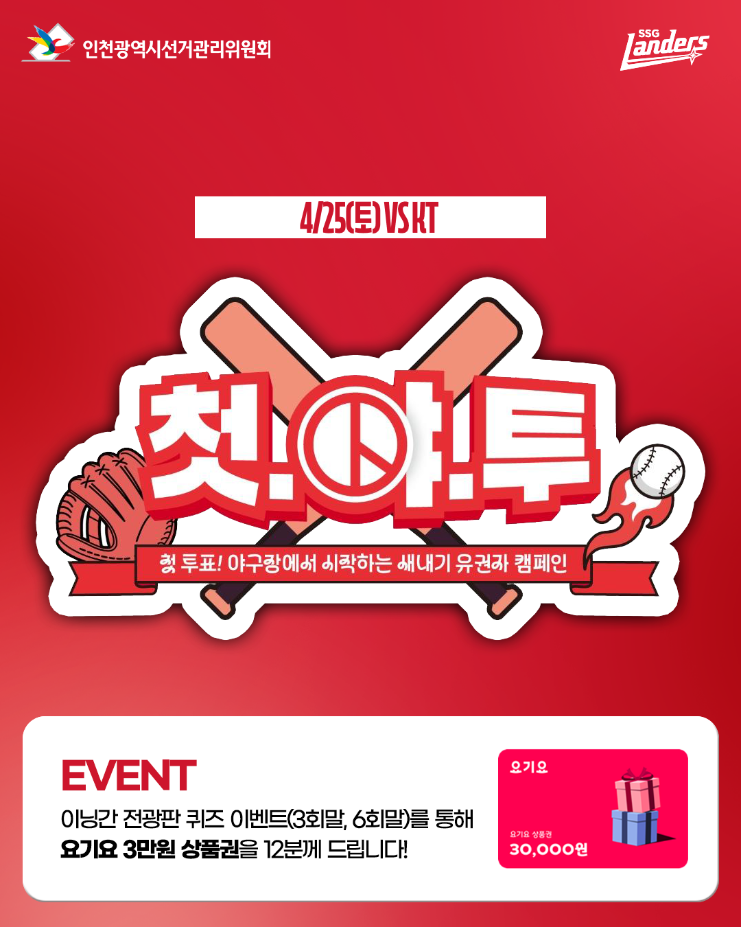 MEDIA 글자 크기 보통 크게 아주 크게 공유하기 페이스북 X 카카오톡 링크 복사 링크 복사됨 도구 보기 이미지 다운로드 SSG랜더스, 25일(토) KT전에 ‘인천시선거관리위원회 데이’ 개최 2026.04.23 신세계야구단