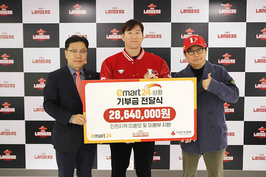 SSG랜더스(대표이사 민경삼, 이하 SSG)는 15일(수) 이마트24와 함께 ‘이마트24 삼진 기부 캠페인’을 통해 적립한 기부금을 인천사회복지공동모금회에 전달했다.